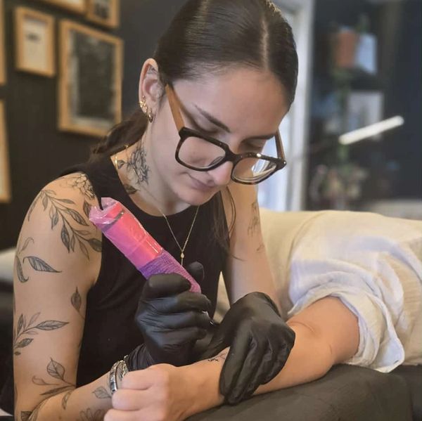 Maïka travaille avec finesse et confiance. Des fleurs aux animaux, elle adore les projets lignes fines agrémentés de dot work. Maïka se spécialise également en écritures.
